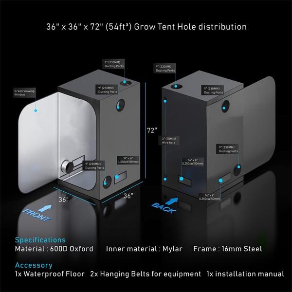 - Eriti paks Oxford-kangas: valmistatud kõrgekvaliteedilisest Oxford-materjalist, mis on vastupidav rebenditele. Sisemine osa on valmistatud Mylar-materjalist, mis suurendab kasvu telkide valgustus efektiivsust. Tuleb ka märkida, et telkide pinnad on valmistatud keskkonnasõbralikest, mürgivabadest ja lõhnavabadest materjalidest.